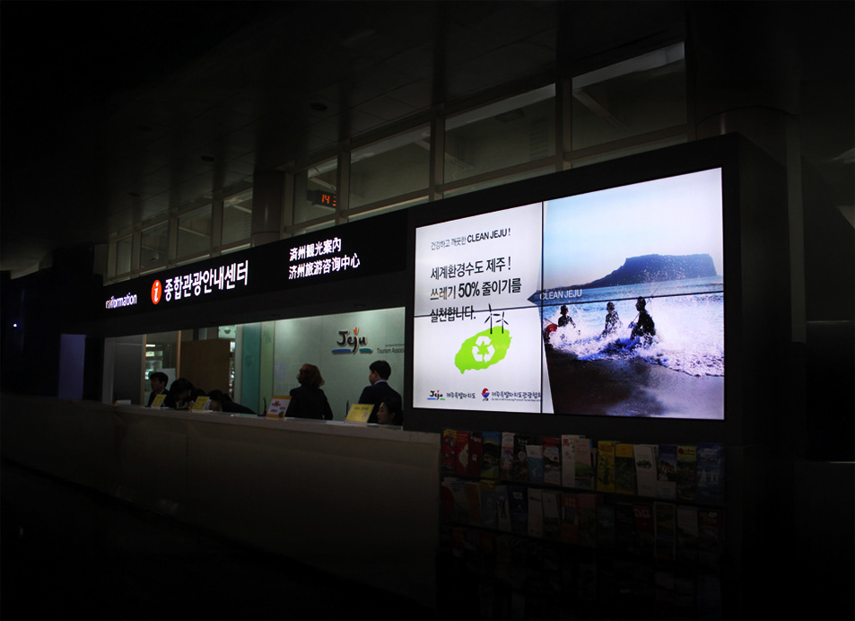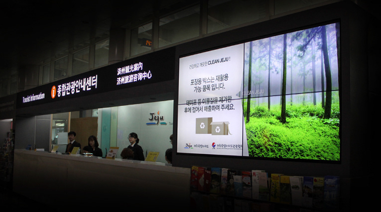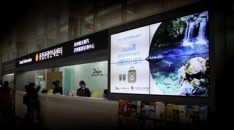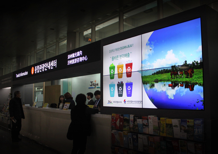 A digital airport ad design featuring Jeju’s nature, promoting recycling and eco-awareness. It visually engages travelers with clear environmental messages from the moment they arrive.